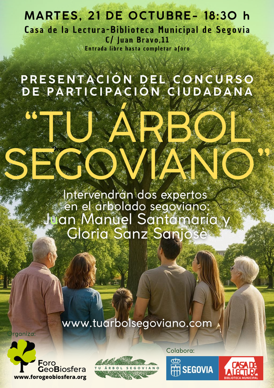 El próximo martes 21 de octubre, a las 18:30 h, en la Casa de la Lectura – Biblioteca Municipal de Segovia, tendrá lugar la presentación del concurso de participación ciudadana “Tu árbol segoviano”, una iniciativa impulsada por la asociación Foro Geobiosfera.